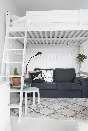 Heb je een hoog plafond, waarom geen hoogslaper nemen? Op die manier kan je een bureauhoekje of zetel onder je bed plaatsen zonder daarbij extra ruimte in te nemen.