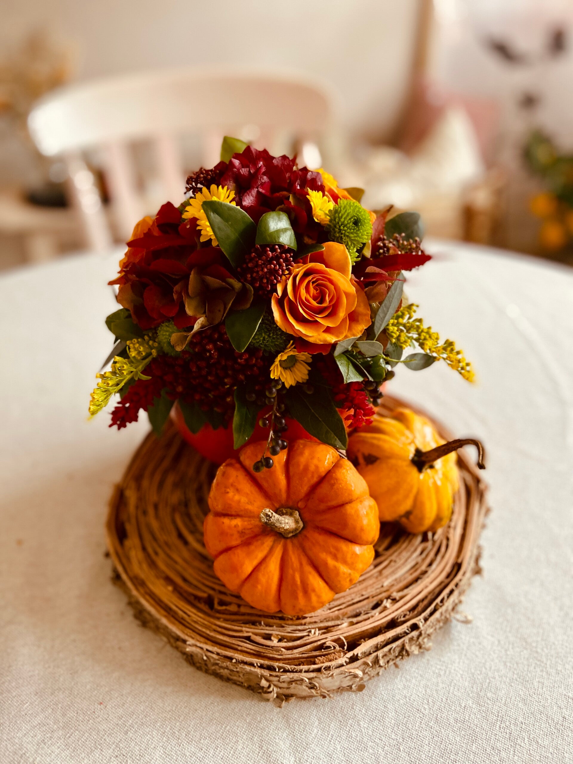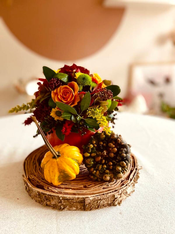 Middelgrote pompoen gevuld met verse seizoensbloemen. Al dan niet gepresenteerd op houten schijf (diameter 30 cm) en met 1 siervrucht.