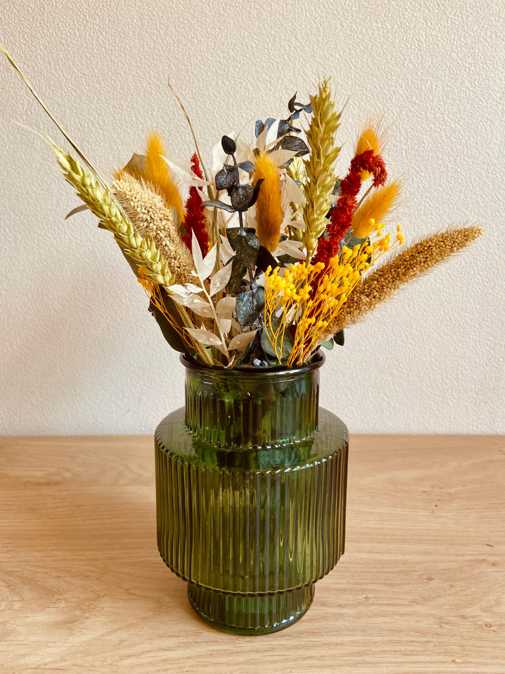 Modern donkergroen vaasje. Past perfect met een herfstig of een kerstig boeketje!