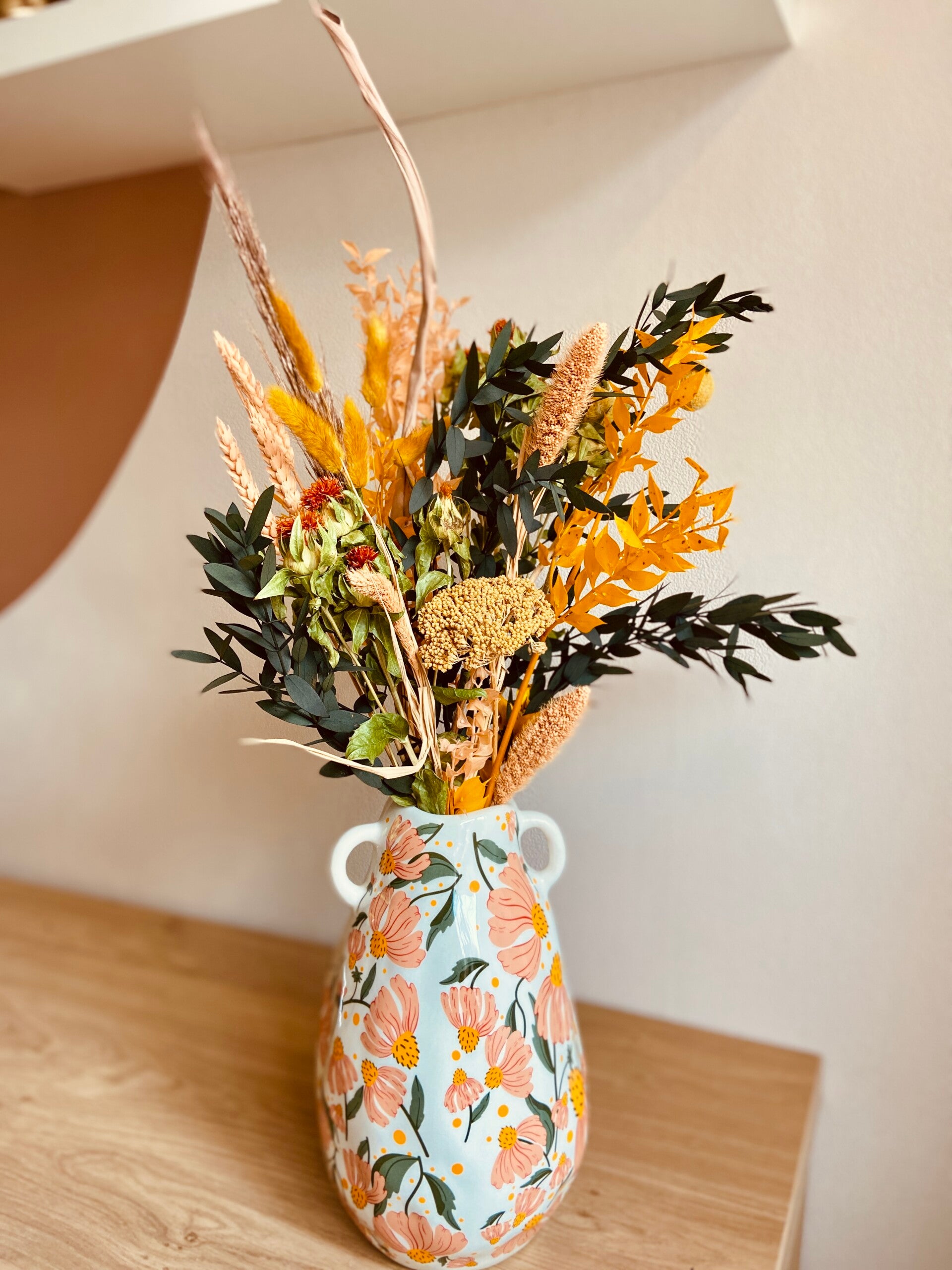 Prijs inclusief droogboeket zoals afgebeeld in gele, zalmkleurige en groene tinten.