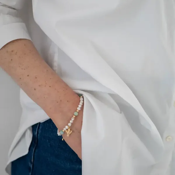 De armband is gemaakt van gefacetteerde rivierparels en natuurlijke aquamarijnstenen, met k18 vergulde roestvrijstalen cactusvormige hanger.