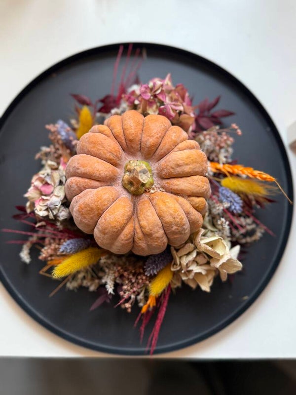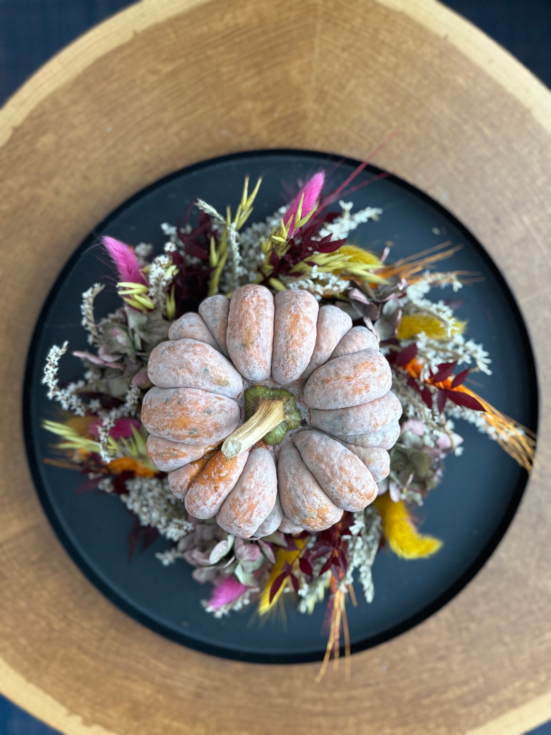Rondom de pompoen ligt een droogkrans in herfsttinten.