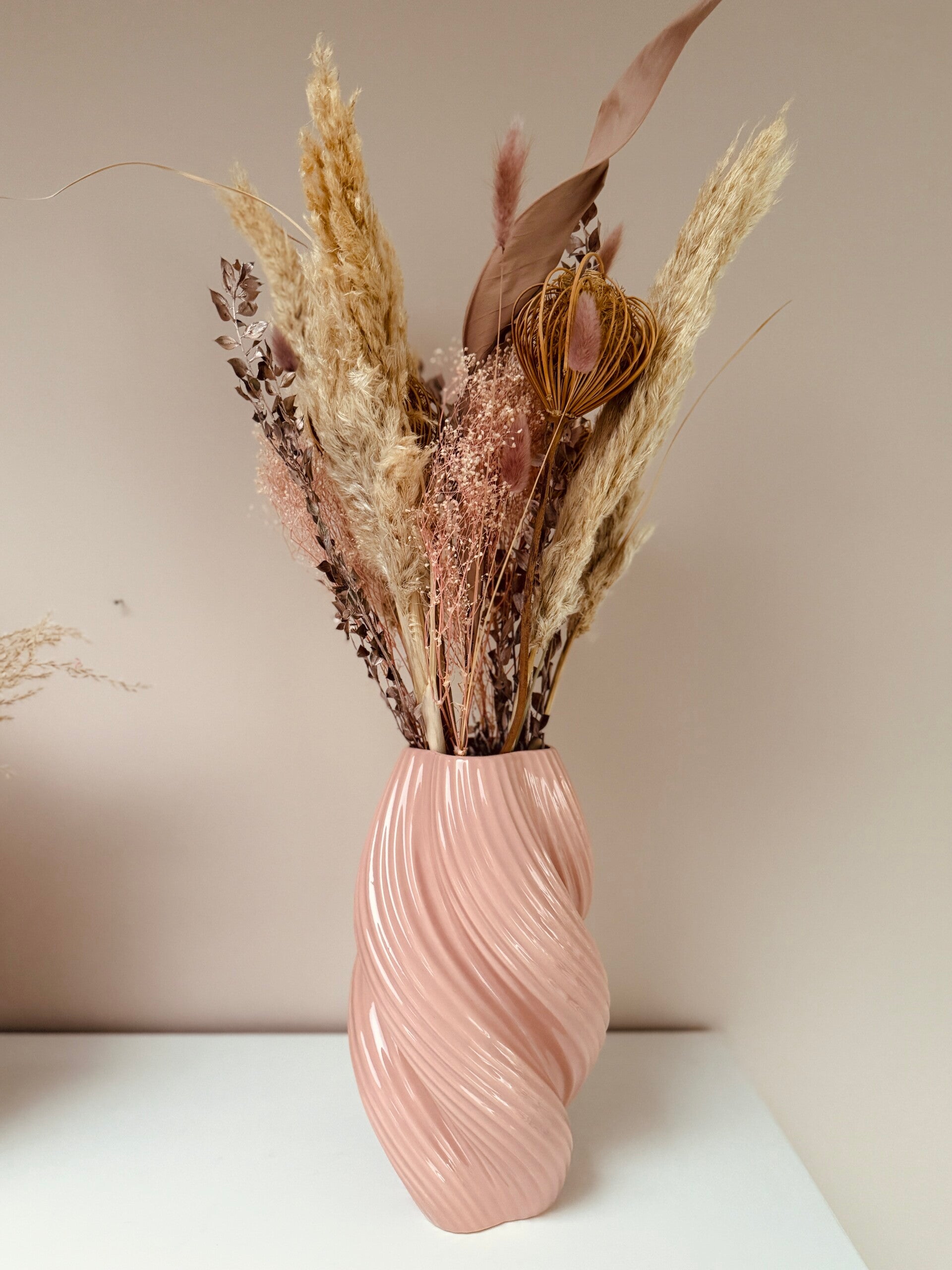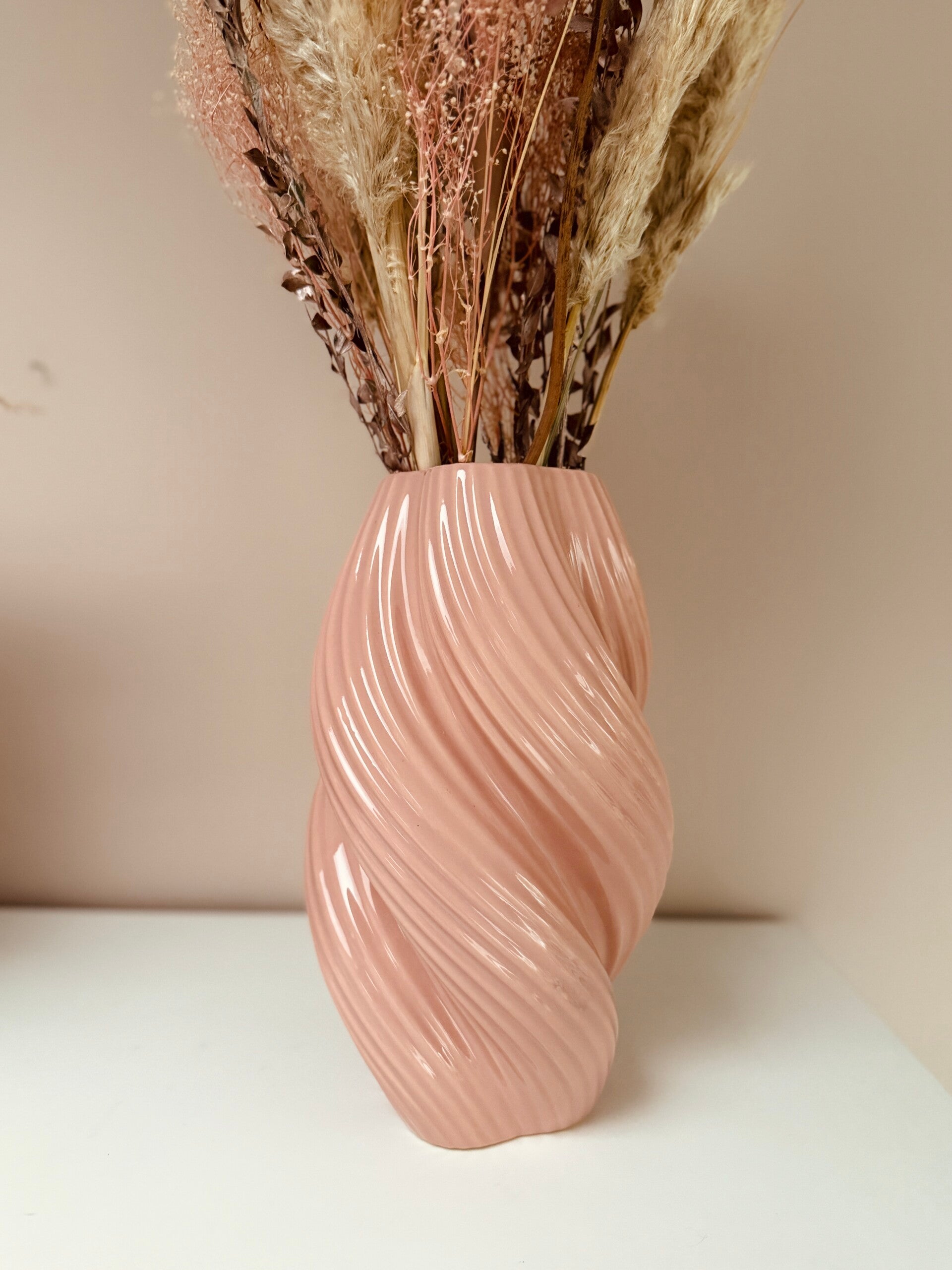 Deze modieuze roze keramieken vaas met golvende vorm past in zowel een minimalistisch als een eclectisch interieur.