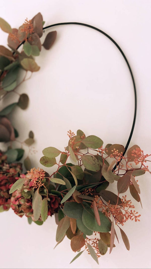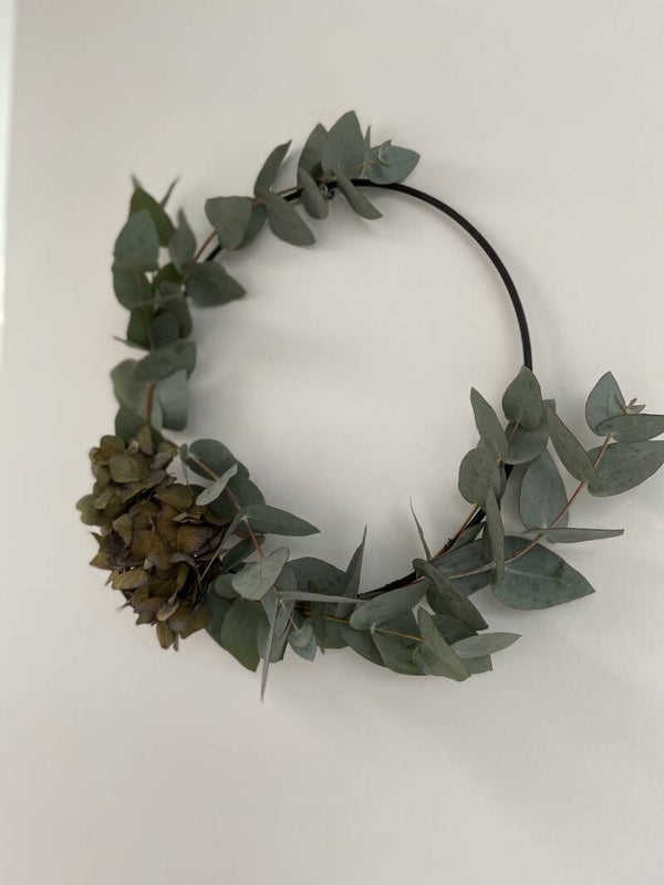 Deze krans met verse eucalyptus (en gedroogde hortensia - onder voorbehoud van seizoen) kan je volledig laten indrogen en is een prachtige wanddecoratie. Je kan de krans ook op een kast plaatsen tegen de muur.
