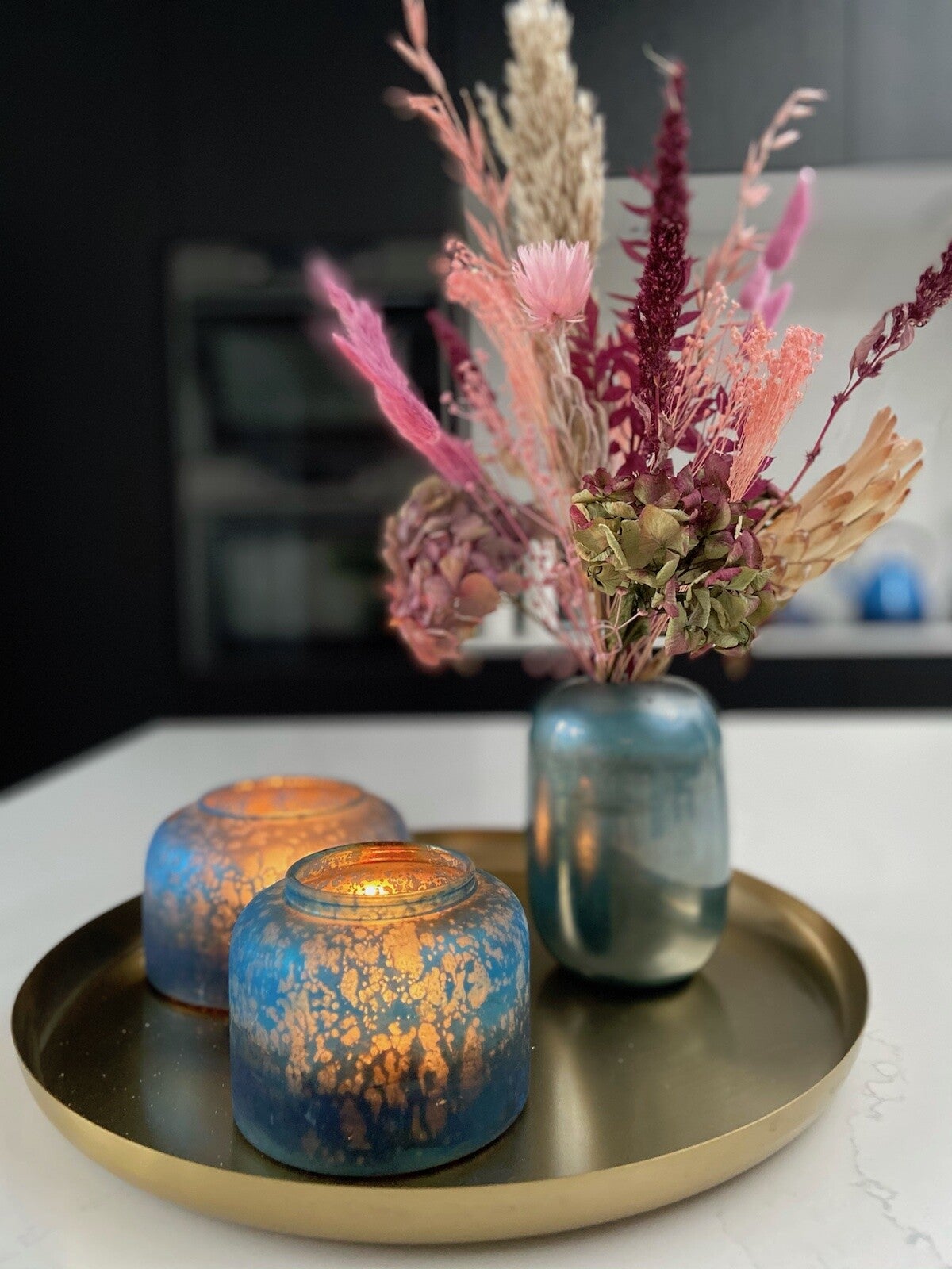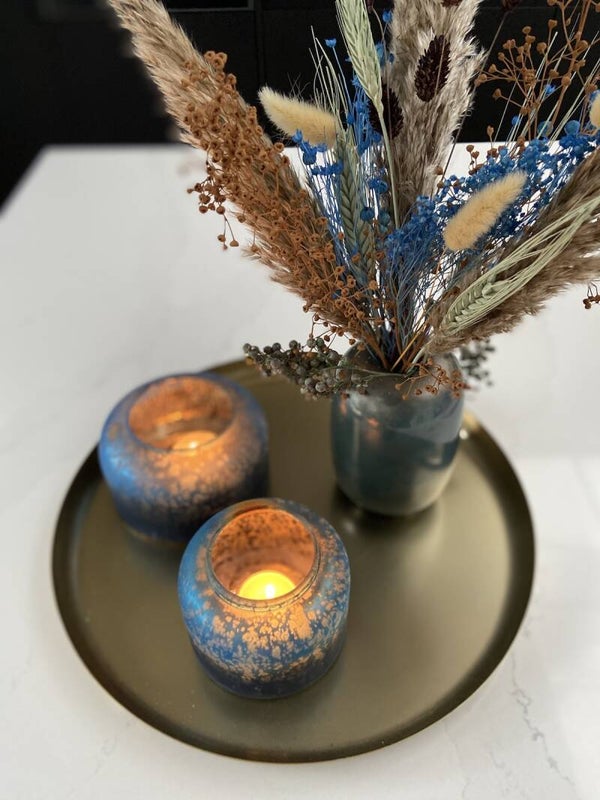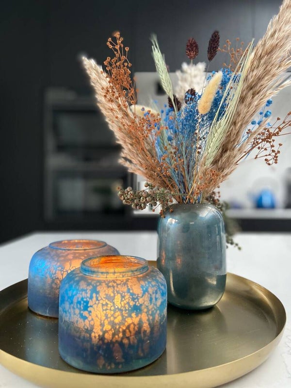 Deze afgeronde stevige glazen vaas in prachtig blauw heeft een hoogte van 13 cm en diameter 9 cm.