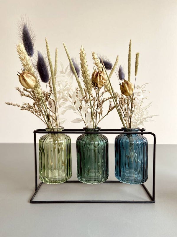 Deze moderne zwarte metalen houder met 3 vaasjes in kleuren groen-blauw gevuld met bloemetjes wordt als set verkocht.