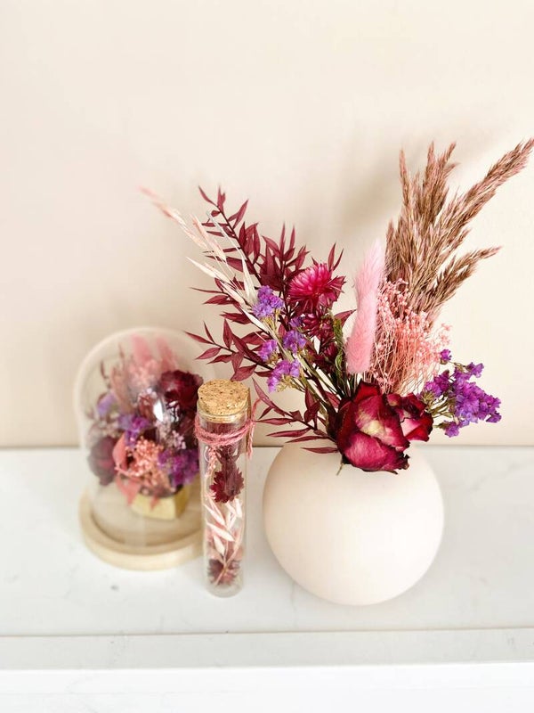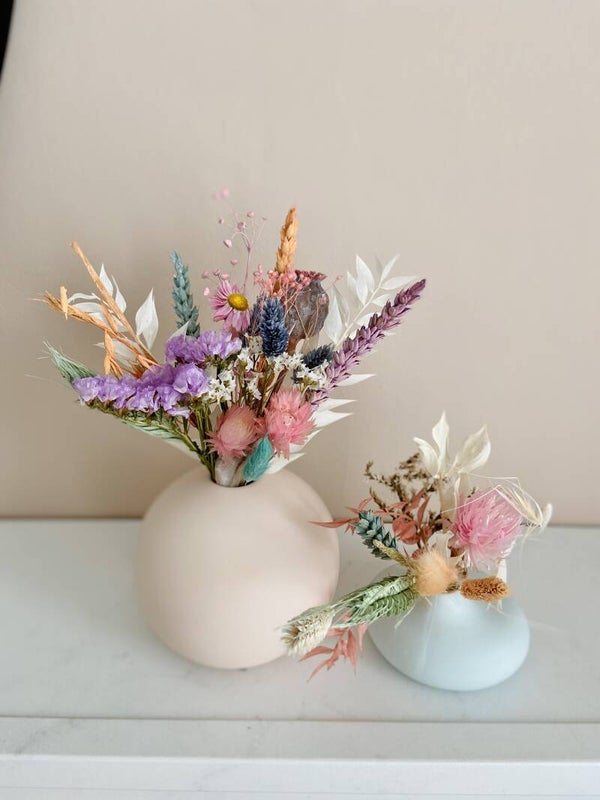 Deze modieuze zachtroze bolvormige vaas is van mat keramiek. Je kan ze perfect vullen met een klein droogboeketje.
