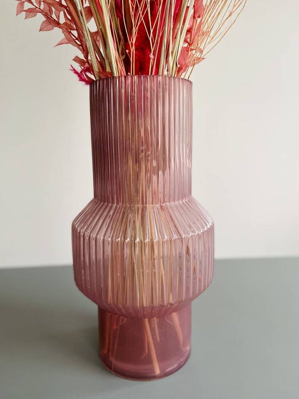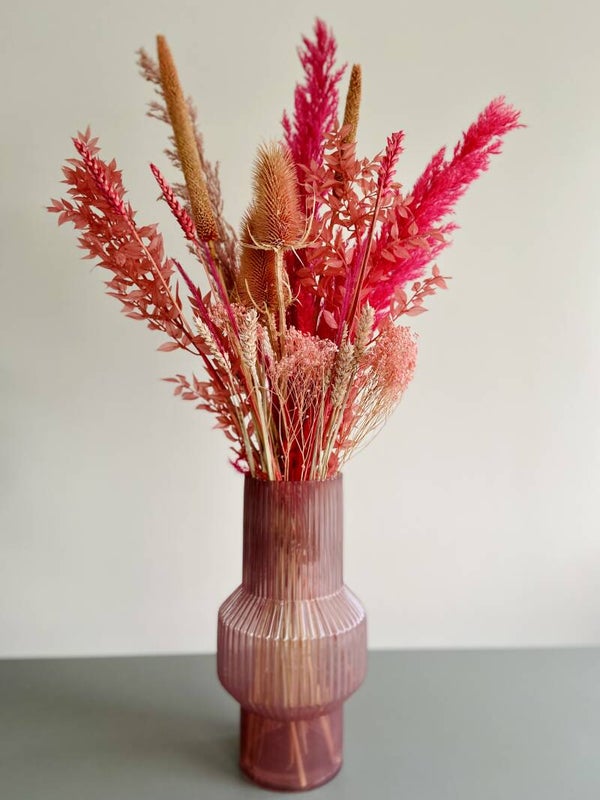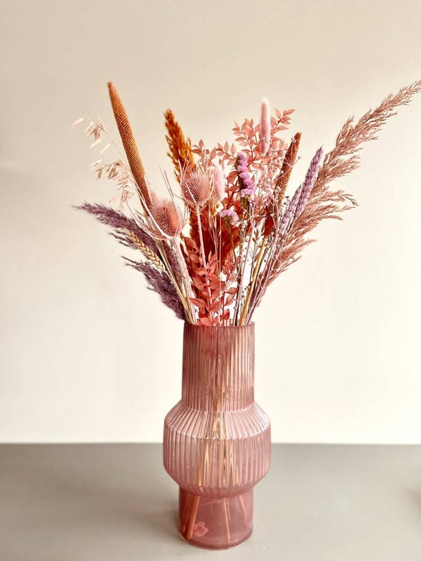 Deze glazen vaas in retrostijl is een eyecatcher in uw woning. Laat ze vullen met een large of XL droogboeket (zie voorbeeld) en je pronkstuk zal direct in het oog springen.