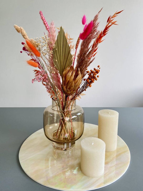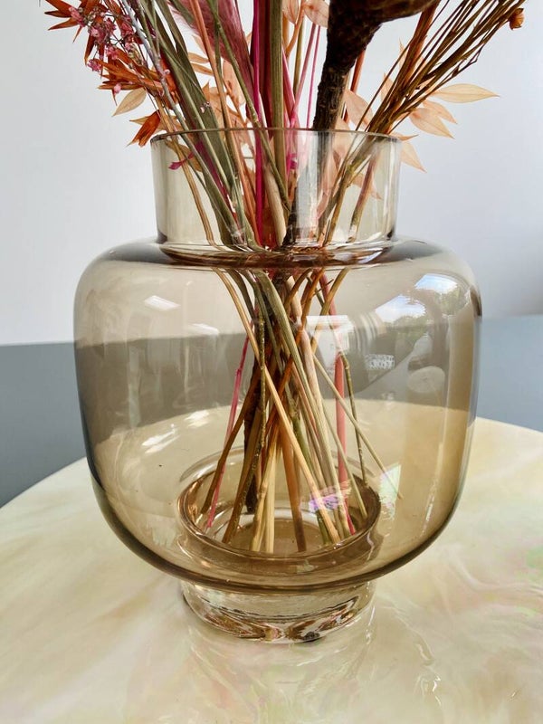 Deze moderne vaas in bruin glas is op zich al een mooi object. Combineer het met een droogboeket in kleur naar keuze en je krijgt er een eyecatcher bij.