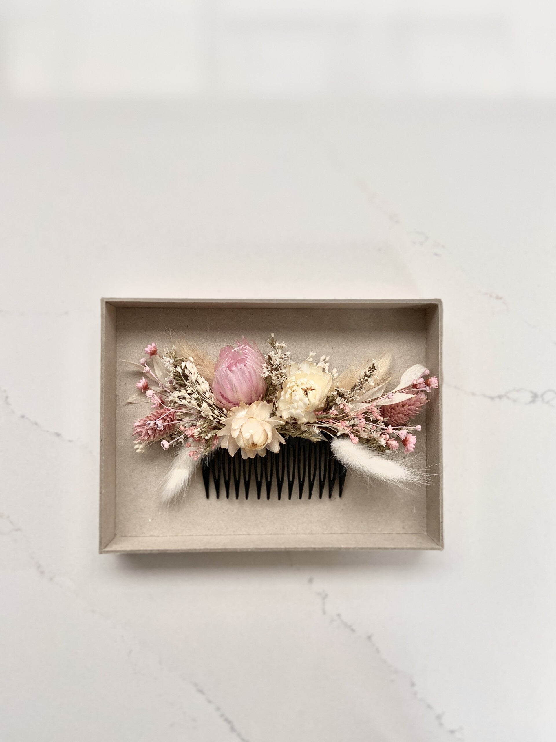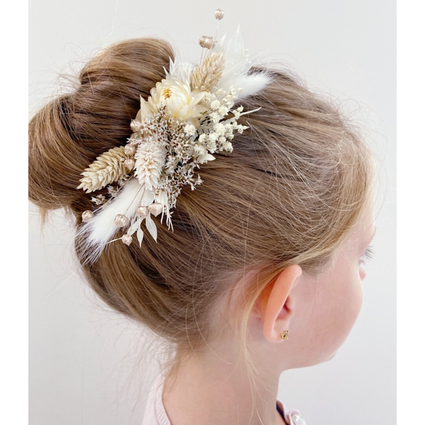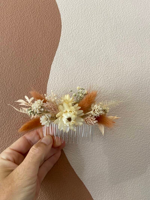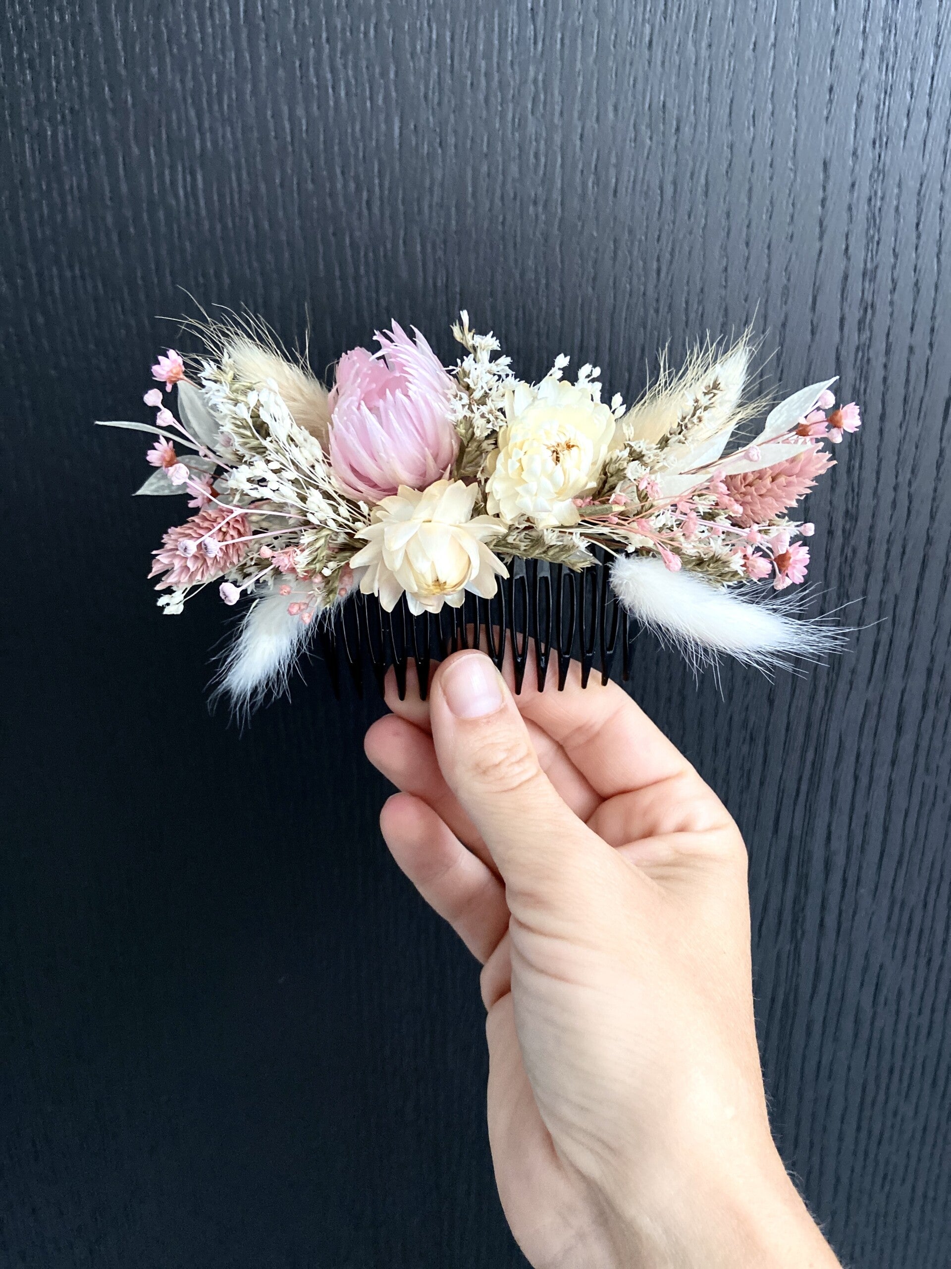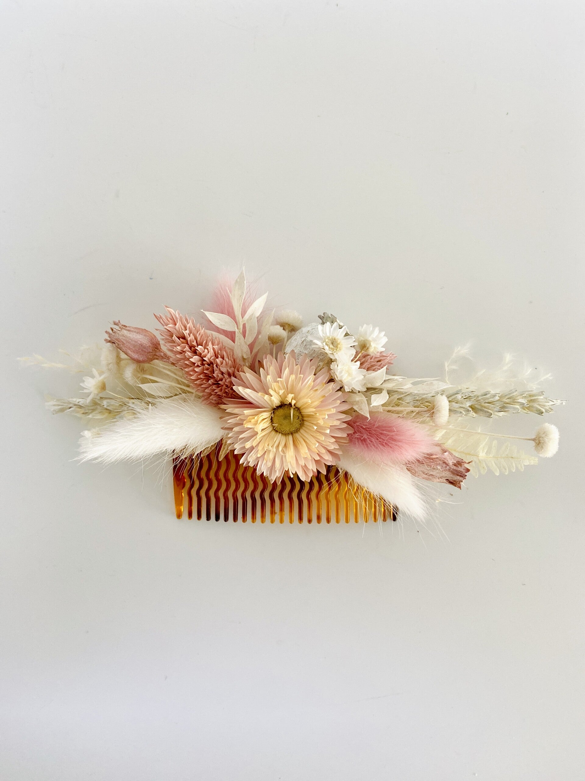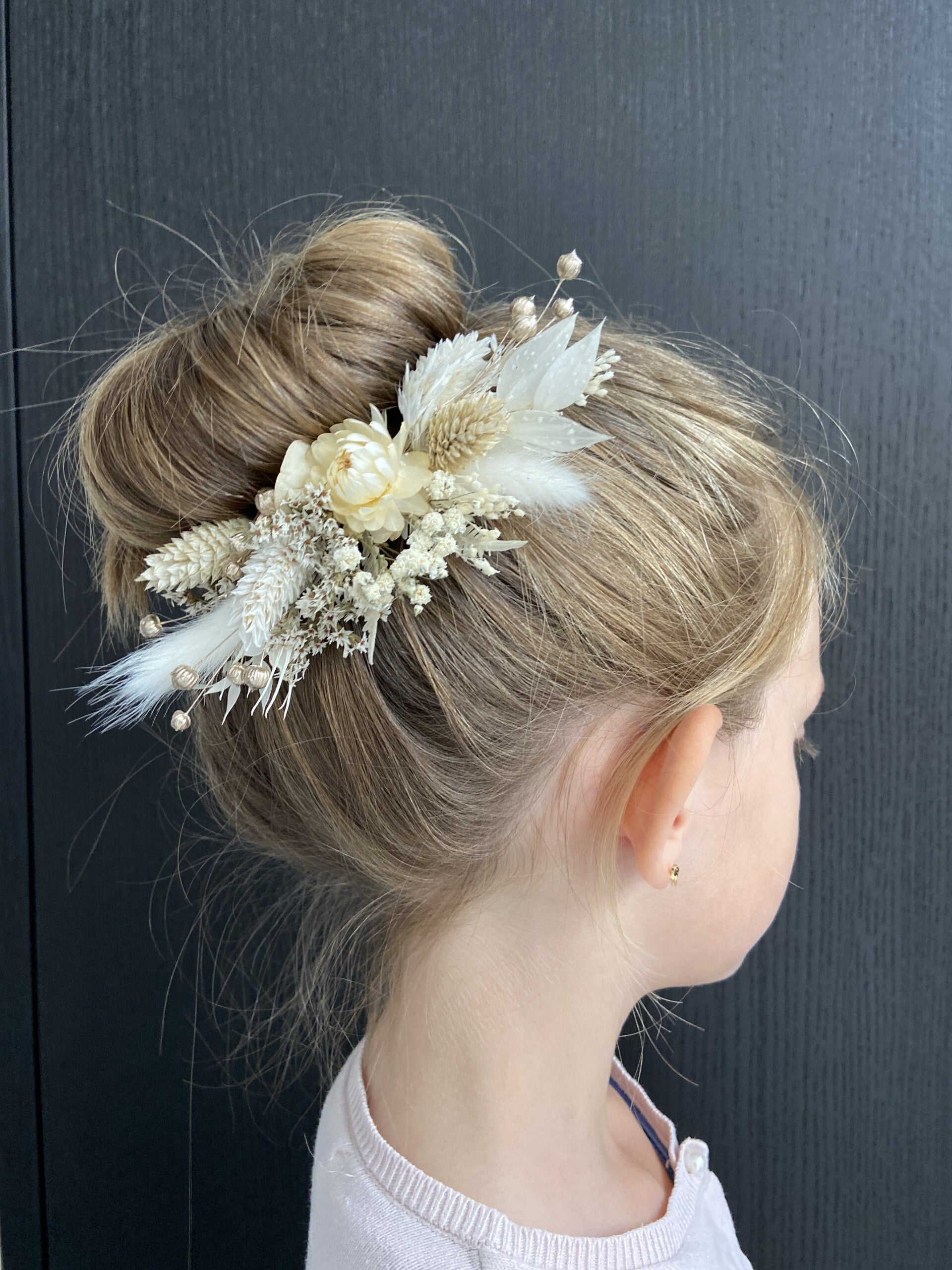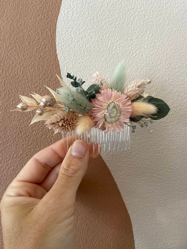 Wat maakt je feestelijke outfit helemaal af? Inderdaad, deze prachtige haarkam met droogbloemen in kleur en stijl naar keuze.