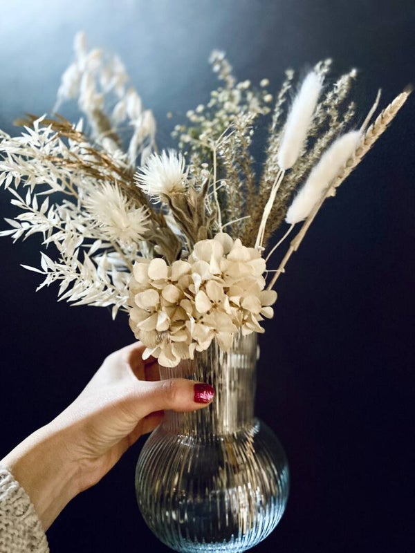Leuke en schattige vaas met een ronde en elegante vorm uit helder glas. Gaat met eender welke kleur van droogboeket en kan enkel gekocht worden met een droogboeket erbij.