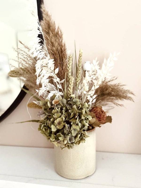 Er wordt gewerkt met luxueuze en exotische droogbloemen zoals geconserveerde hortensia, banksia, palmblad, pampas, enz....