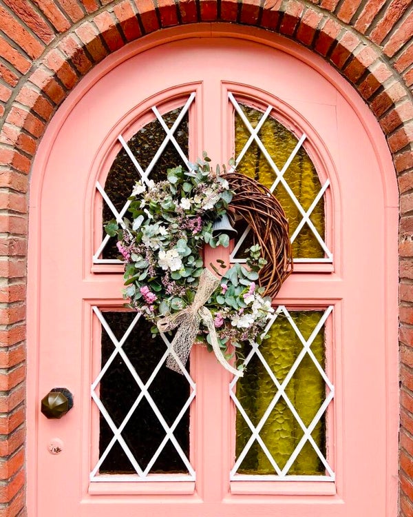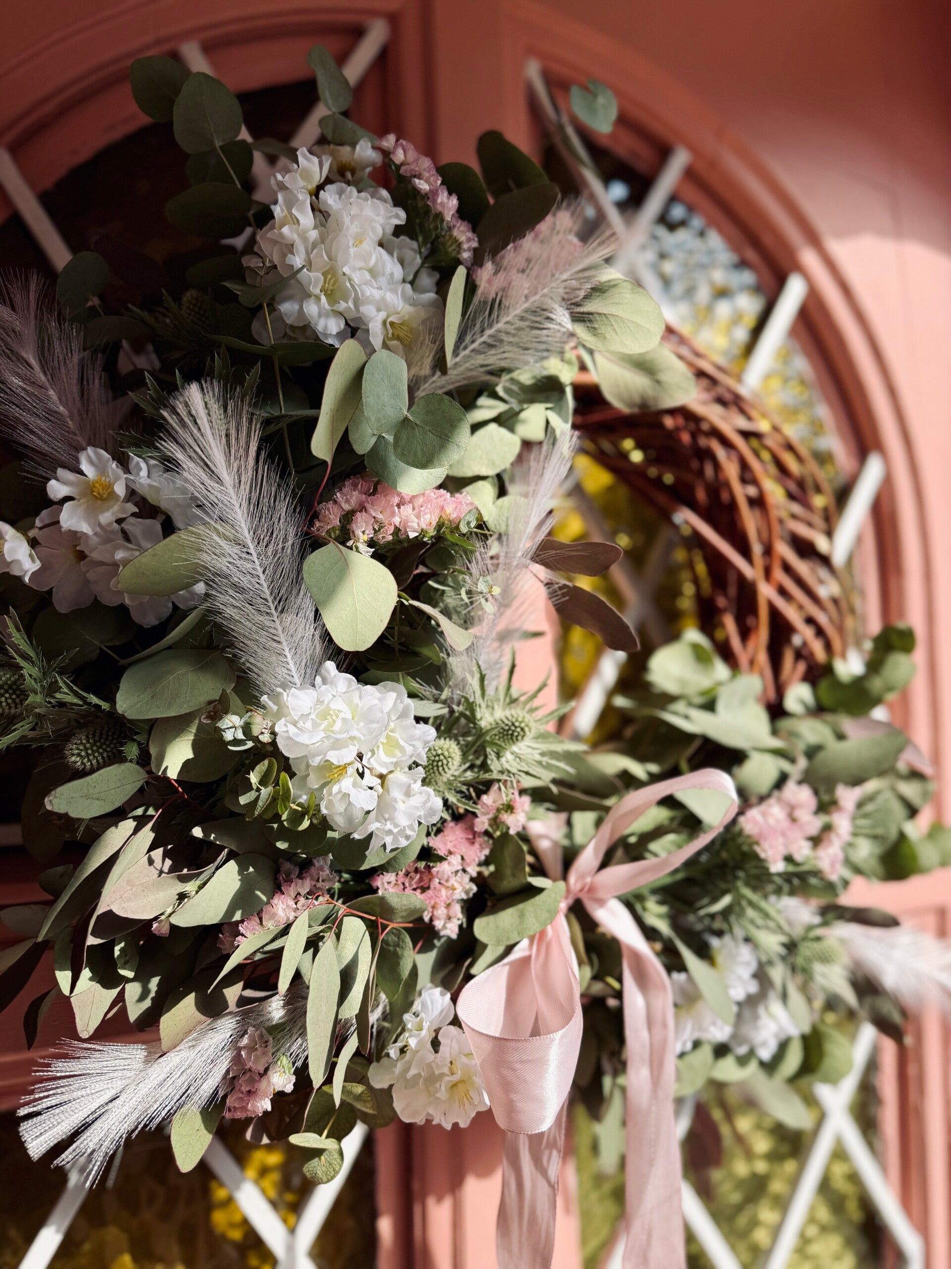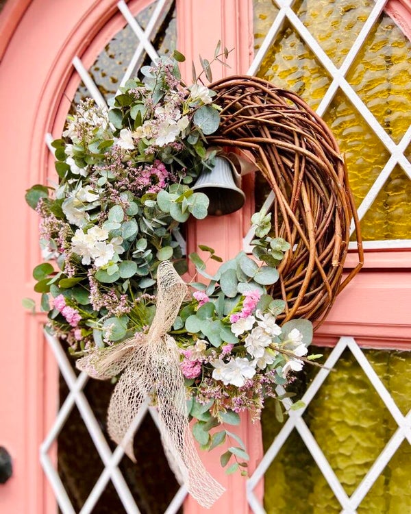 Mooie lentekrans met twijgjes en omwonden met eucalyptus, limonium en kunstbloesems.
