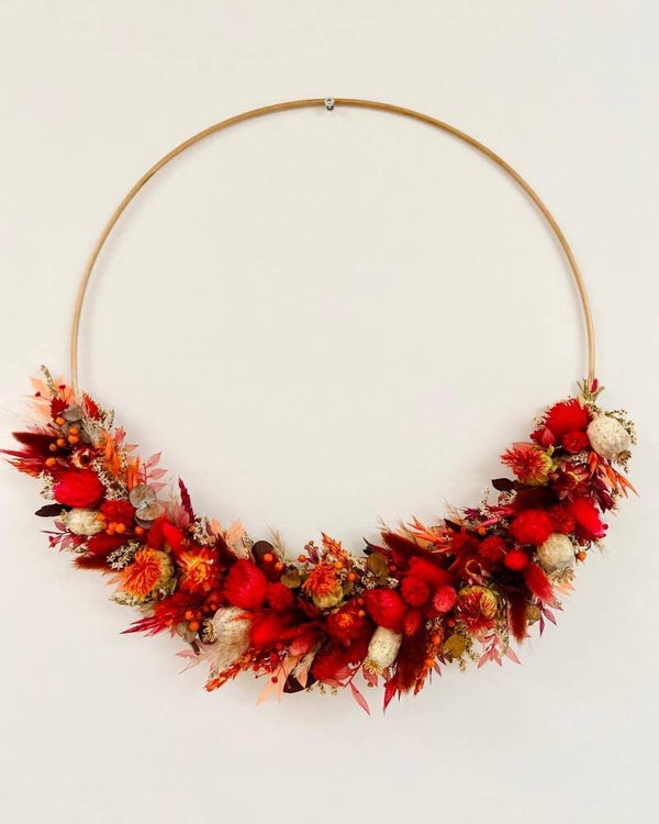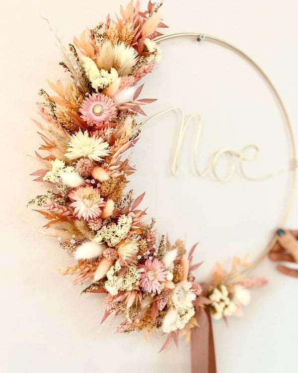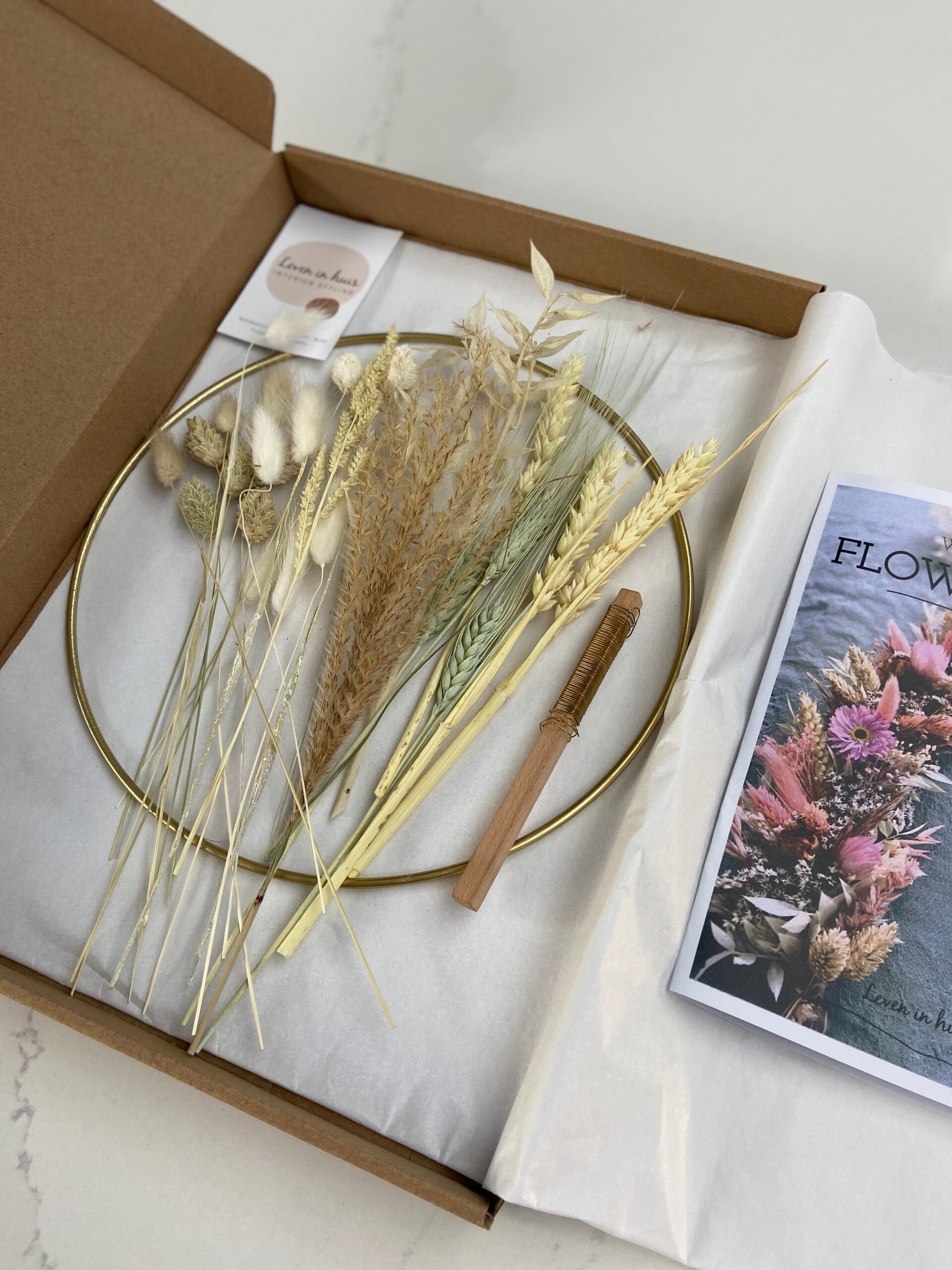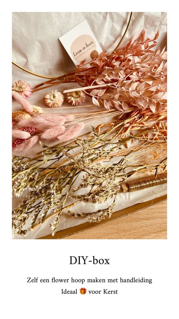 Bestel dan een brievenbuspakket met een flower hoop om op te hangen in goud of zwart (diameter 25 cm) en droogbloemen in kleur naar keuze. Dit pakket past perfect in de brievenbus maar kan ook afgehaald worden in het atelier.