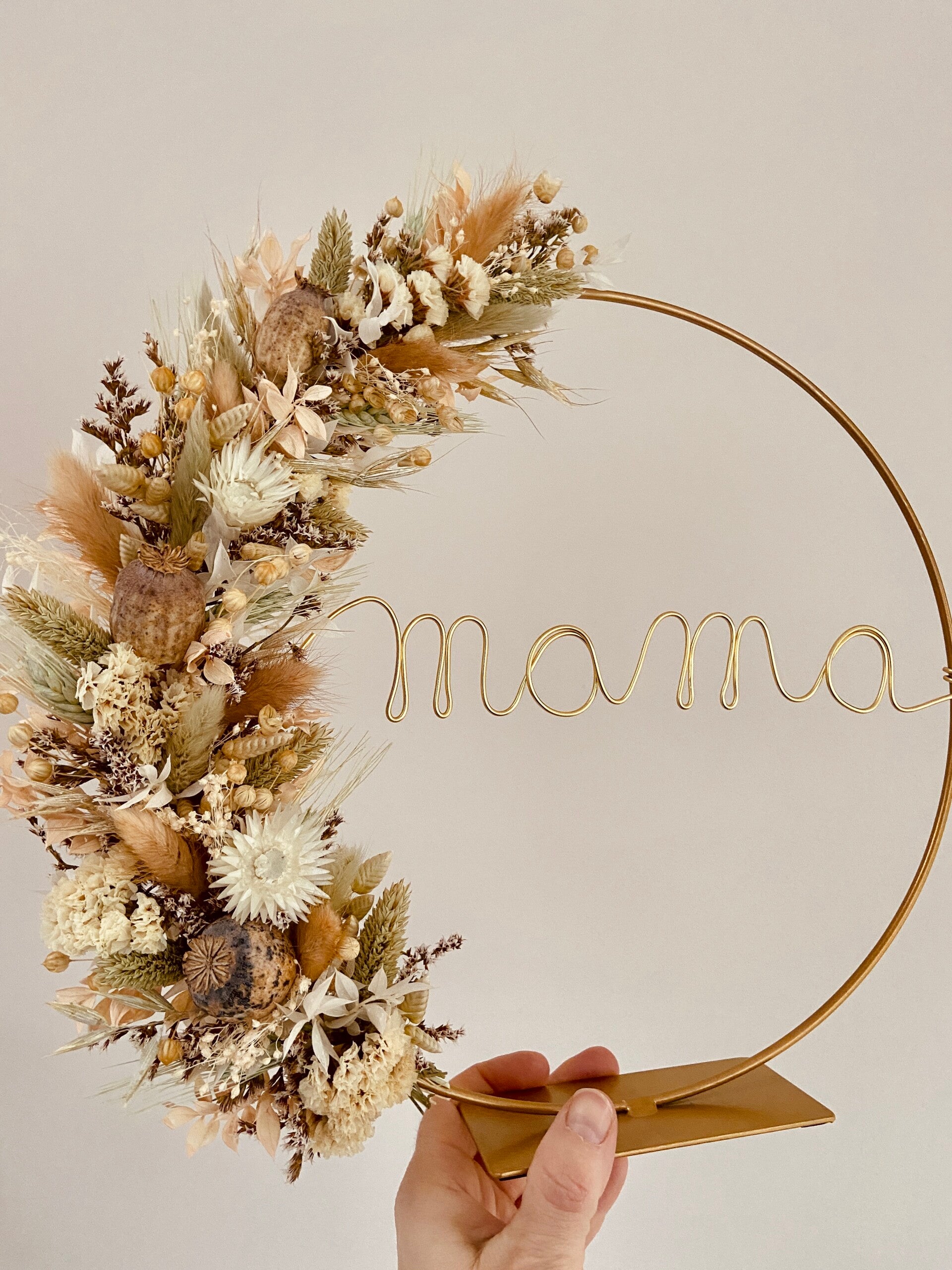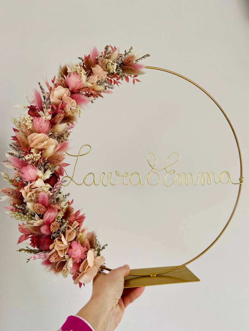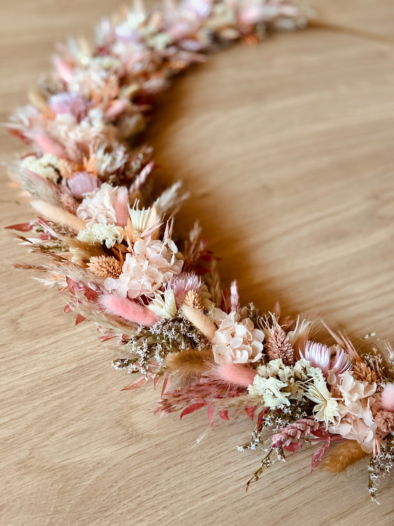 Deze workshop omvat het maken van een flower hoop met droogbloemen van 30 cm diameter, om op te hangen of op een voet.