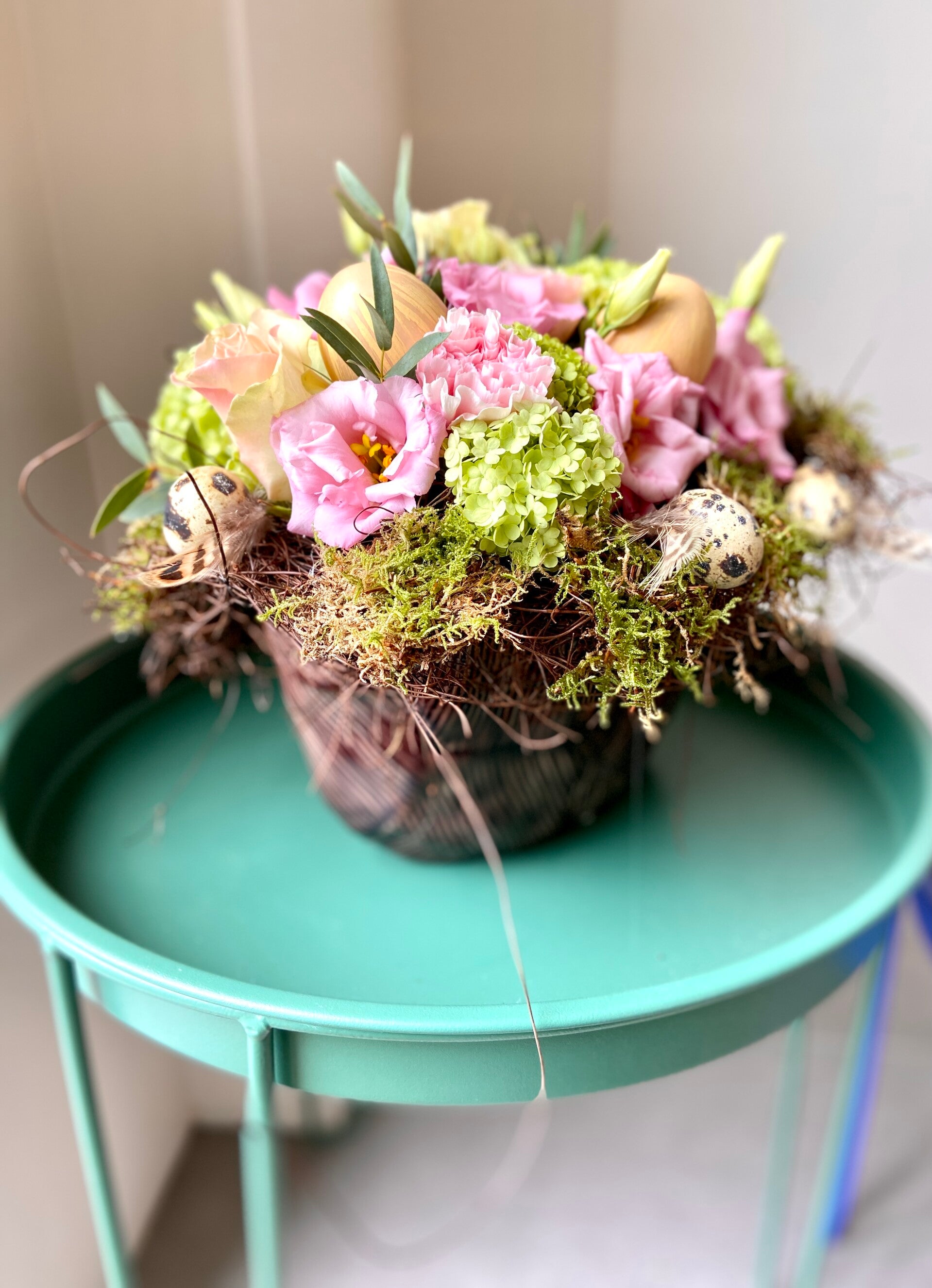 We maken een bloemstuk in steekschuim in een aardewerken pot (foto is niet bindend). Het geheel wordt met eitjes, pluimpjes, vlechtwerk en mos afgewerkt.